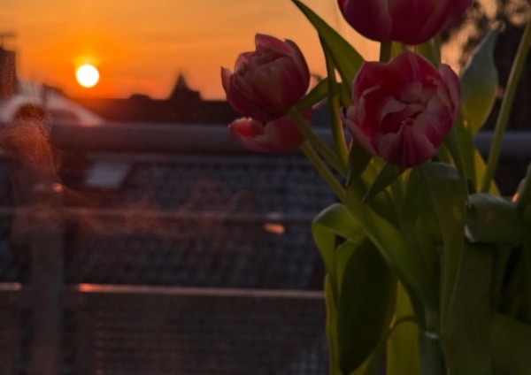 Ми сиділи на балконі, захід сонця фарбував небо в рожеві тони.
