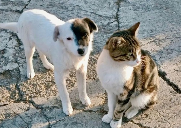 У вузькому просторі між будинками вона побачила їх: кішка сіра, статна, і маленьке тремтяче щеня, що притулилося до неї. Кішка час від часу лизала малюка та озирнулась на людей.